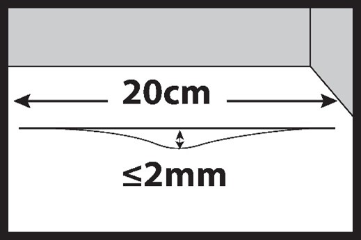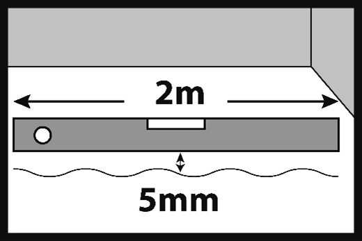 Le irregolarità massime consentite possono arrivare fino a 5 mm, misurate su una superficie lunga 2 m. Le irregolarità puntuali non devono essere superiori a 2 mm su 20 cm.