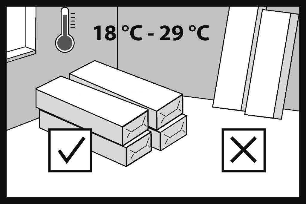 Il pavimento deve essere stoccato nel suo imballaggio originale nella stanza in cui deve essere installato per almeno 24 ore, per garantirne l’acclimatazione. La temperatura dell’aria dovrebbe essere compresa tra +18°C e +29°C.