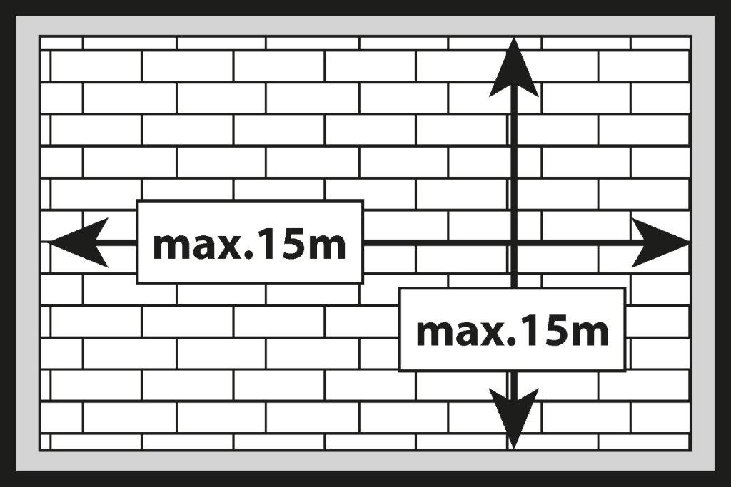 Importante: Non è necessario realizzare fessure di dilatazione nei passaggi da una stanza all’altra. Si realizzano solo intorno alle pareti e ad altri elementi integrati nell’edificio come scale, colonne e altri ostacoli. Le dimensioni massime dell’area del piano della casa/appartamento, in cui il pavimento SPC posato in modo flottante non richiede giunti di dilatazione nelle soglie delle porte, sono di 15 × 15 m.