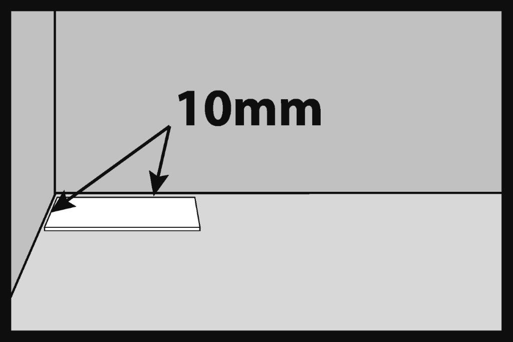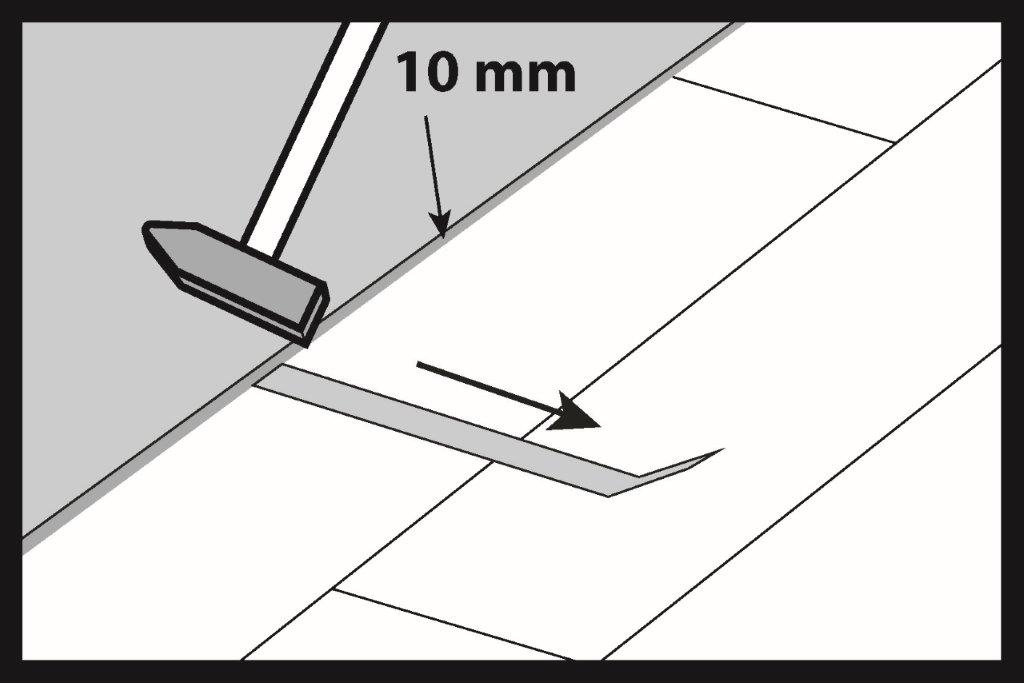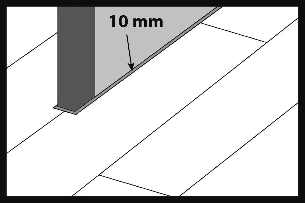 L’installazione inizia dal lato sinistro del muro e si prosegue verso destra. La dimensione della fessura di dilatazione deve essere di almeno 10 mm. I cunei di dilatazione possono essere utili per mantenere costante la dimensione della fessura. La fessura di dilatazione deve essere realizzata lungo il perimetro della stanza e intorno a tutti gli altri ostacoli come colonne, scale, piastrelle di ceramica, ecc.