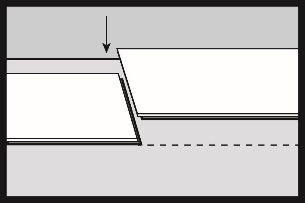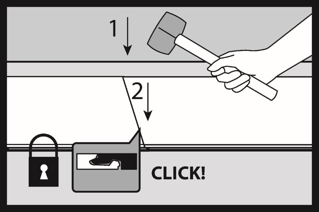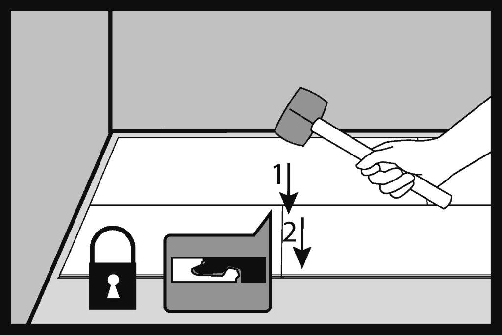 Colpisci delicatamente il giunto con un martello non rimbalzante (sabbia o gomma bianca) e chiudi il giunto seguendo l’ordine di colpi 1 e 2. Con il giunto correttamente chiuso, la superficie superiore dei pannelli deve essere livellata e non deve esserci alcuna differenza di livello tra gli elementi uniti.