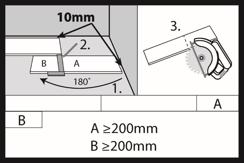 Per tagliare i pannelli puoi utilizzare una sega manuale o elettrica. Ricorda di lasciare una fessura di dilatazione di almeno 10 mm dopo aver tagliato l’ultimo pannello. La lunghezza consigliata dell’ultimo pannello tagliato (A) nella prima fila del pavimento deve essere di almeno 200 mm. Se il pezzo tagliato (B) è più lungo di 200 mm, può essere utilizzato per iniziare l’installazione della seconda fila di pavimento. La distanza tra le giunzioni frontali in due file adiacenti del pavimento deve essere di almeno 200 mm.