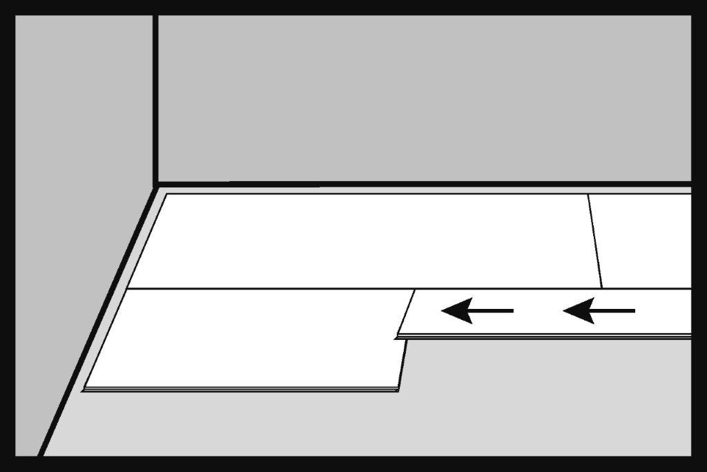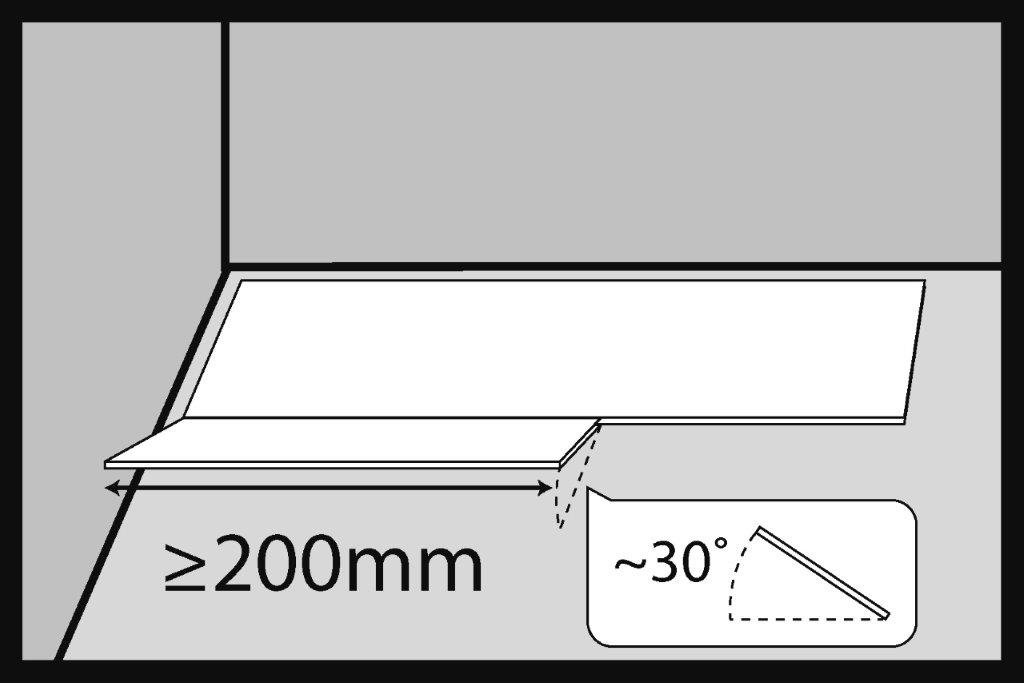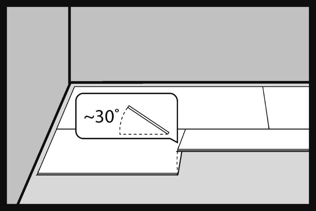 Il primo pannello SPC della seconda fila viene inserito nel giunto del pannello della prima fila con un angolo di circa 30°. La lunghezza consigliata del pannello SPC da installare deve essere di almeno 200 mm.