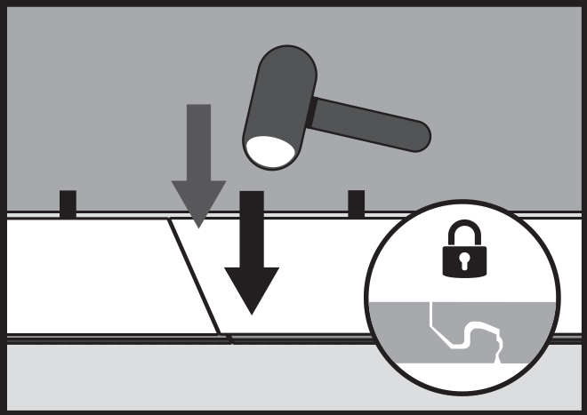 Batti il pannello sul lato lungo usando la mazzetta. Installando i pannelli, batti sulla giunzione del lato lungo (utilizzando sempre la mazzetta).