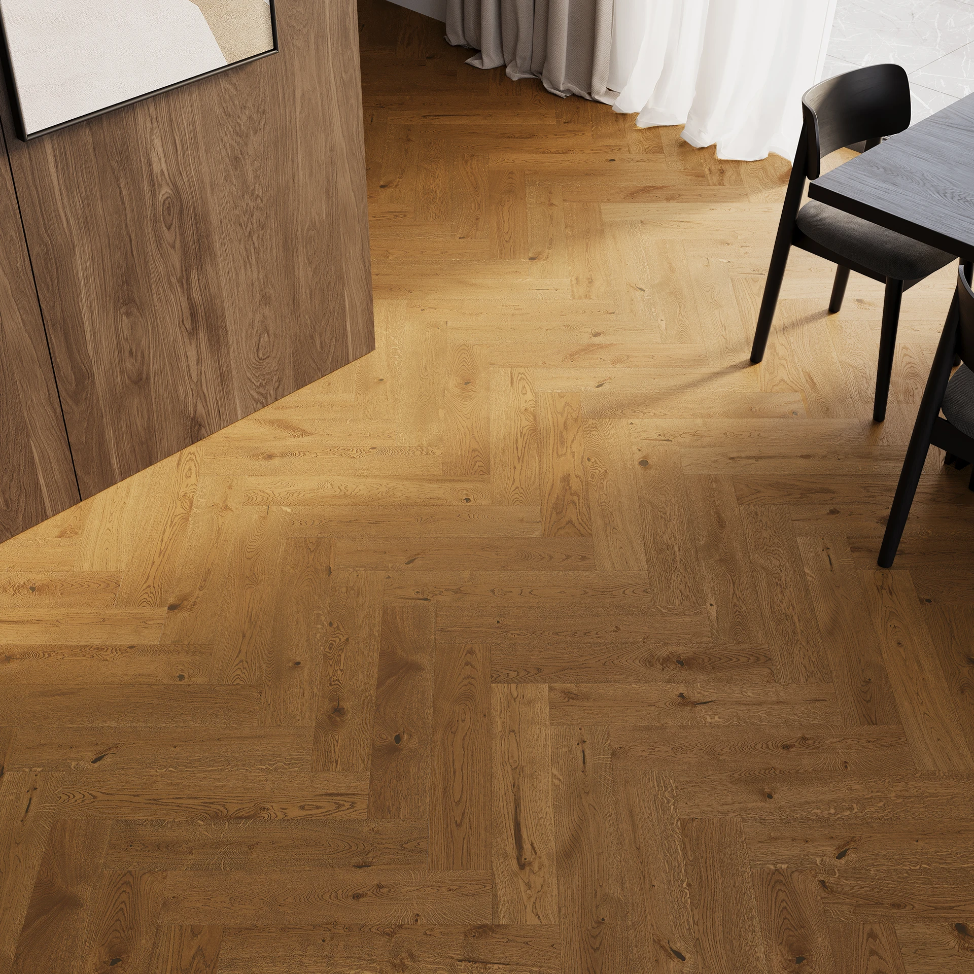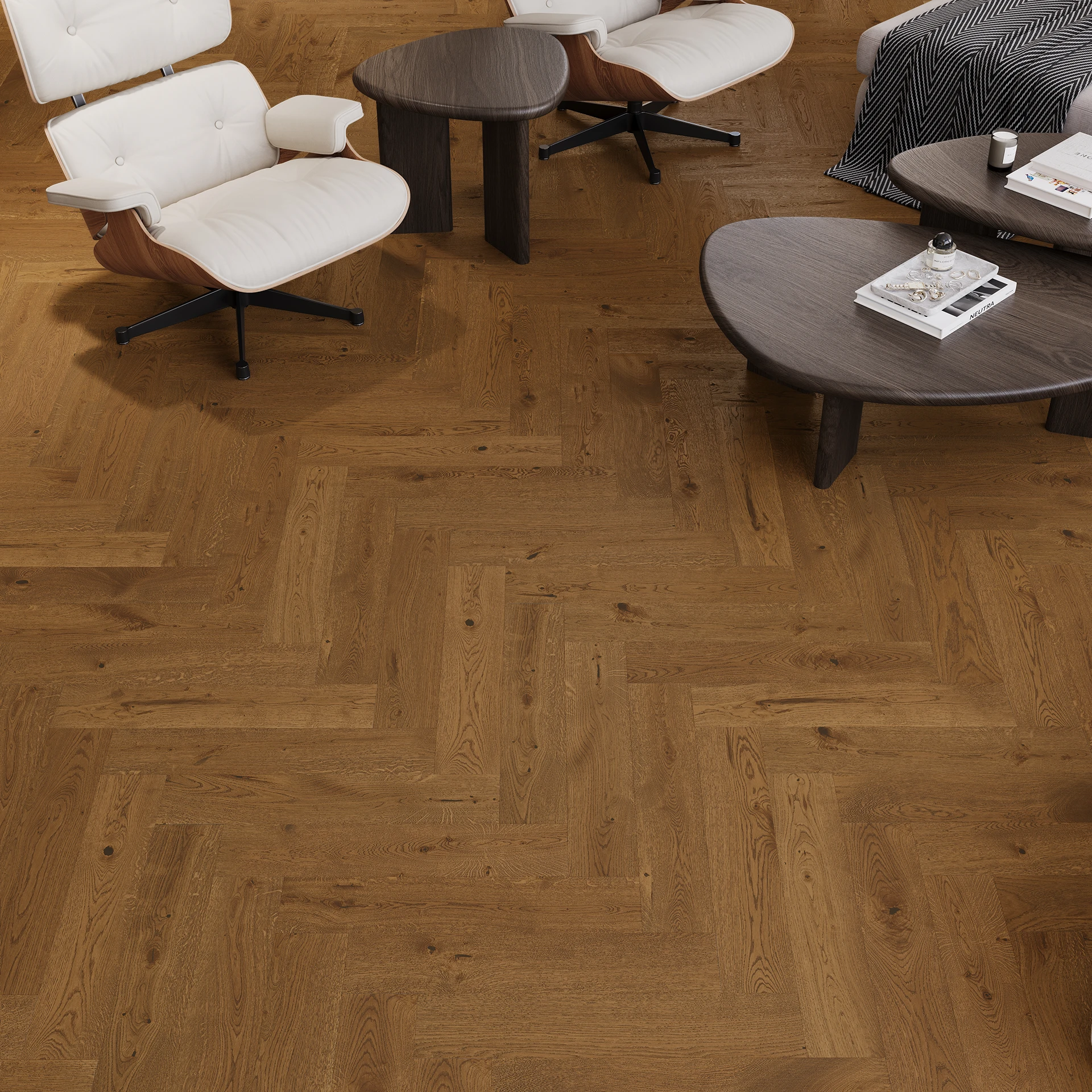 Pavimento in rovere di un caldo colore marrone antico. Rivestito con vernice opaca. La struttura del legno è stata esaltata tramite spazzolatura, mentre i bordi delle tavole sono stati enfatizzati con una microbisellatura. Il pavimento è in versione a 1-lamella.