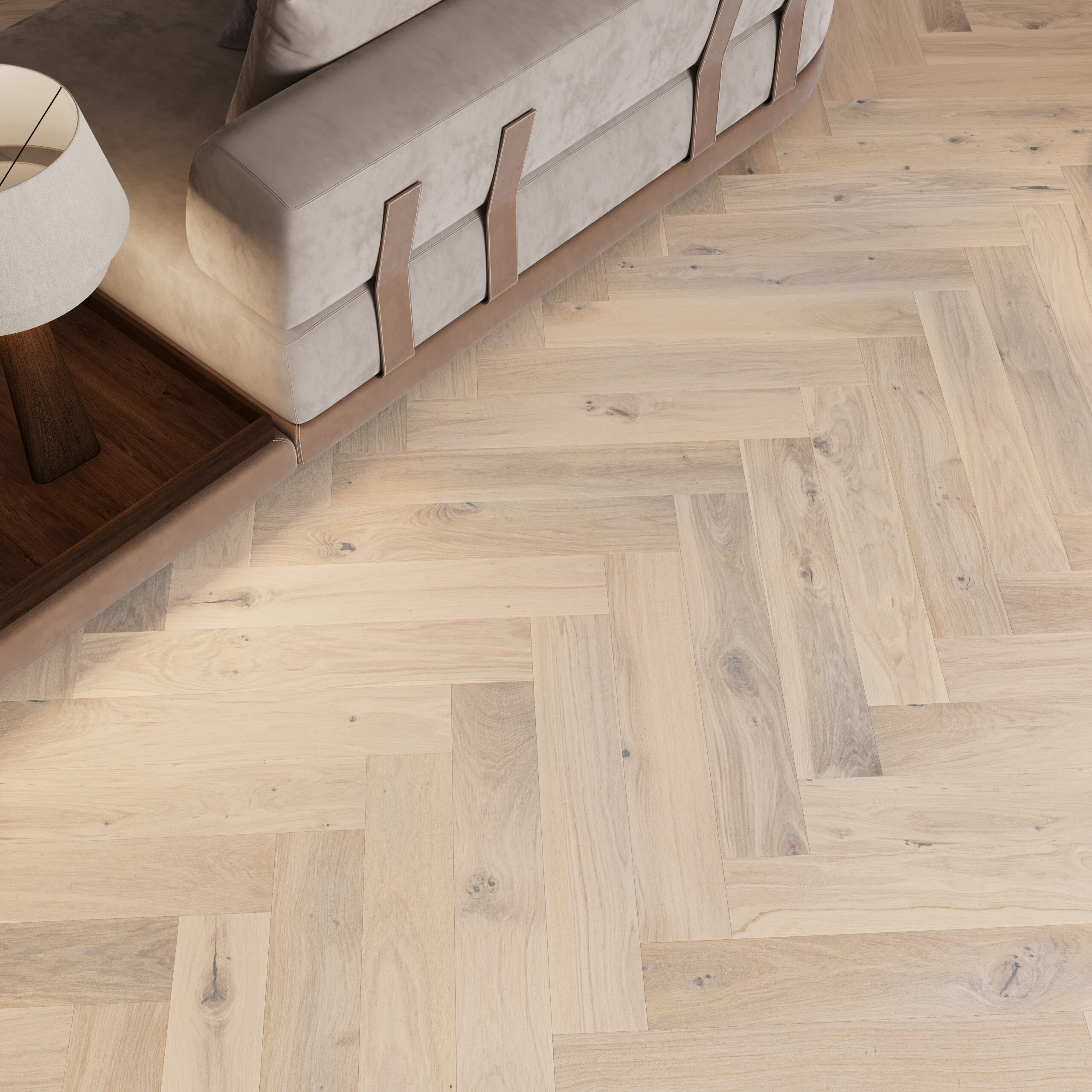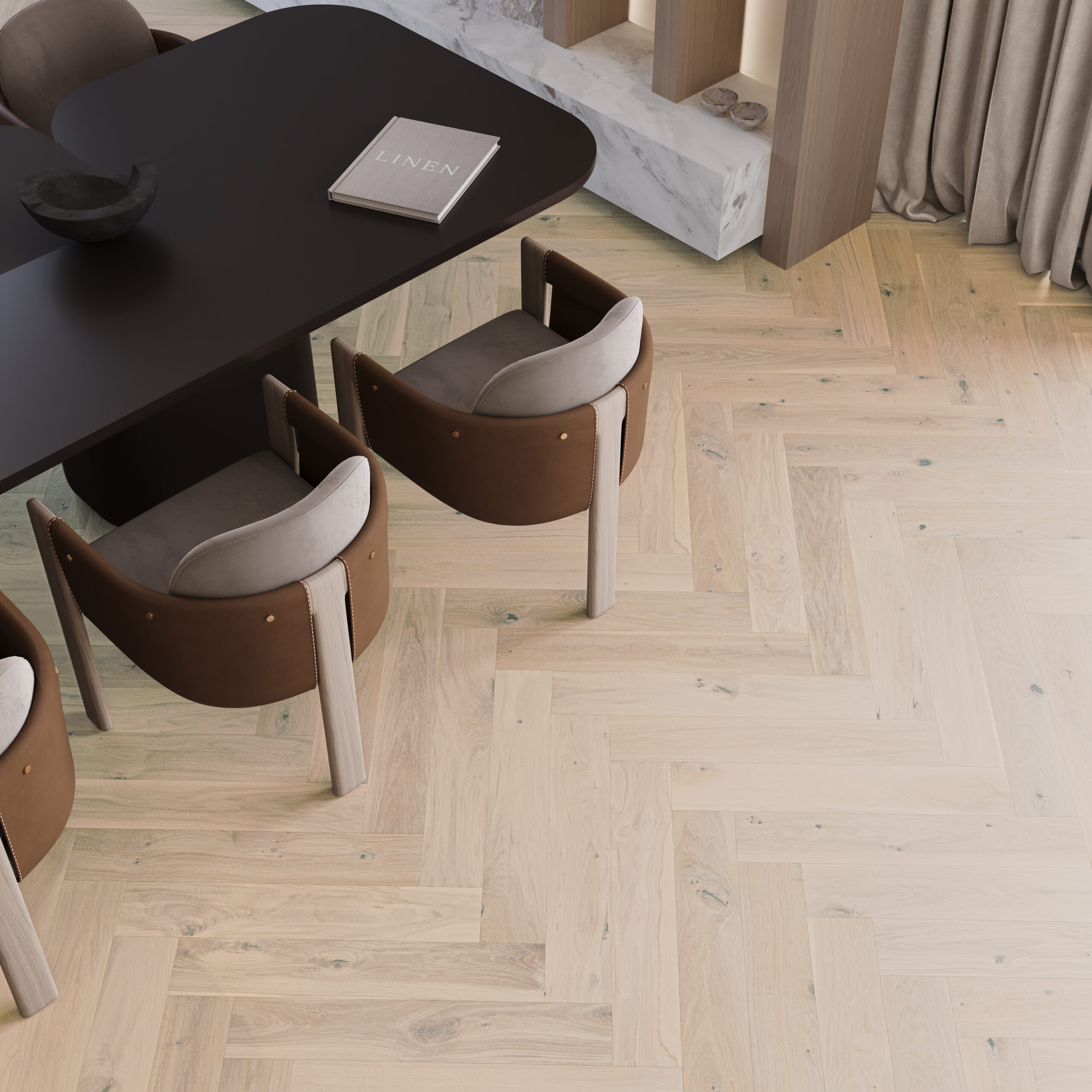 Pavimento in rovere a 1-lamella con una delicata tonalità crema-bianco. Le tavole sono state rese pregiate tramite spazzolatura e protette con vernice opaca.