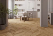 Deska dębowa o mocno wyeksponowanych cechach drewna i przyjemnym odcieniu ciepłego brązu. Podłoga poddana procesom szczotkowania i fazowanie, dzięki którym zostały podkreślone struktura oraz forma. Wykończona lakierem matowym.