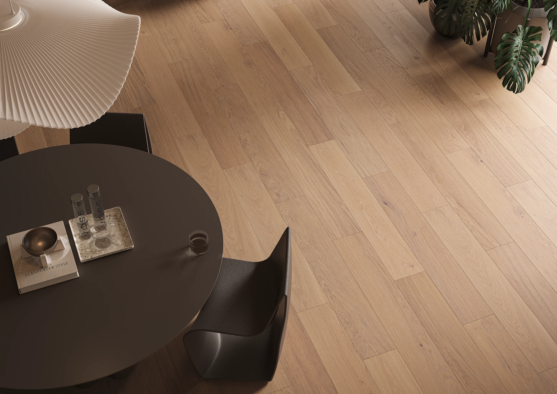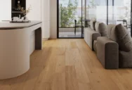 Parquet in rovere leggermente sbiancato che unisce eleganza sottile e stile naturale. Il leggero sbiancamento evidenzia il disegno delle venature, illumina il legno e conferisce all’ambiente un carattere fresco e armonioso.